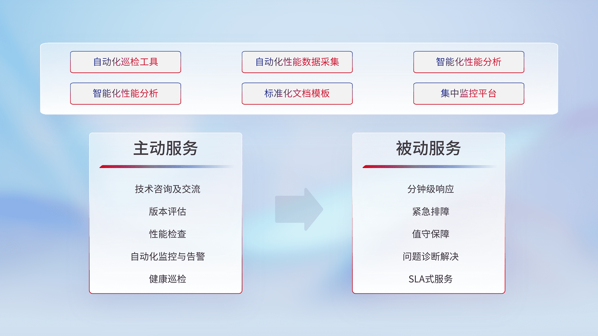 智能化工具和标准化文档,,,保障服务质量,,,提供主动服务(包含技术咨询、、、版本评估、、、、性能检查、、、、自动化监控与告警、、、、健康巡检)和被动服务包含(分钟级响应、、、、紧急排障、、值守保障、、问题诊断解决、、、SLA服务)。。